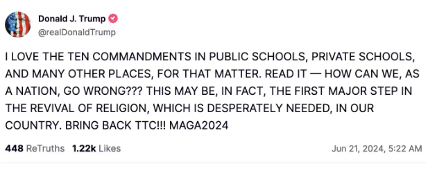 Trump spoke in support of a controversial new Louisiana law that requires the display of the commandments in all public classrooms, which progressives have said is a prime example of Christian nationalism in action.