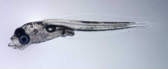 Photograph showing side view of transparent Pacific cod larva with large black eye.