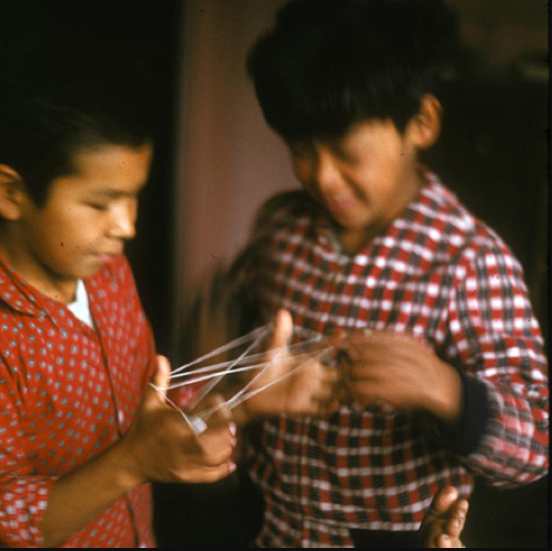 Alutiiq Elders recall making string figures and playing string games as children. In August, girls sang songs and wove string figures to tangle the legs of the sun and slow its departure for the winter. Boys were not allowed to play this game for fear that their fingers would get tangled in their bowstrings while hunting. In spring, children played the sunrise game, using a long length of string, a bead, and a small stick. They tied the string to a nail in a wall, threaded a bead onto the string, and then tied a small stick at the bottom of the string to keep the bead from slipping off. Then, holding the string taut, they jerked it to make the bead run up. This trick, which required lots of practice, was said to hasten the return of the sun.