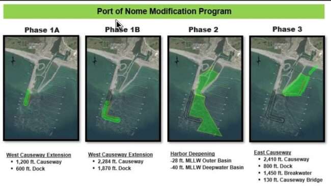 Phase 1A is the first of four phases of the required construction to build the Port of Nome project. The first phase of the project will construct a 1,200-foot causeway extension with about 600 feet of dock face. Following this portion of the project, the Phase 2 dredging of the deep and outer basins up to minus 40 feet is next scheduled for construction. The City of Nome is the non-federal sponsor for this project.